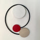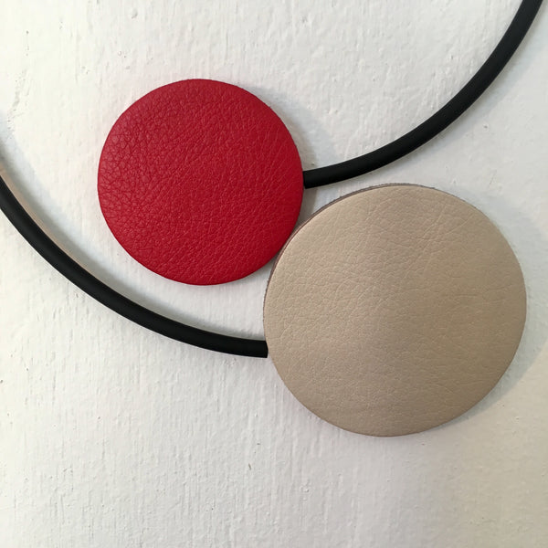 Interesting designed modern necklace which wraps around your neck & sits flat on your chest. Can be worn a few different ways. Circles side by side (as in images), or the smaller circle on top of the larger circle.